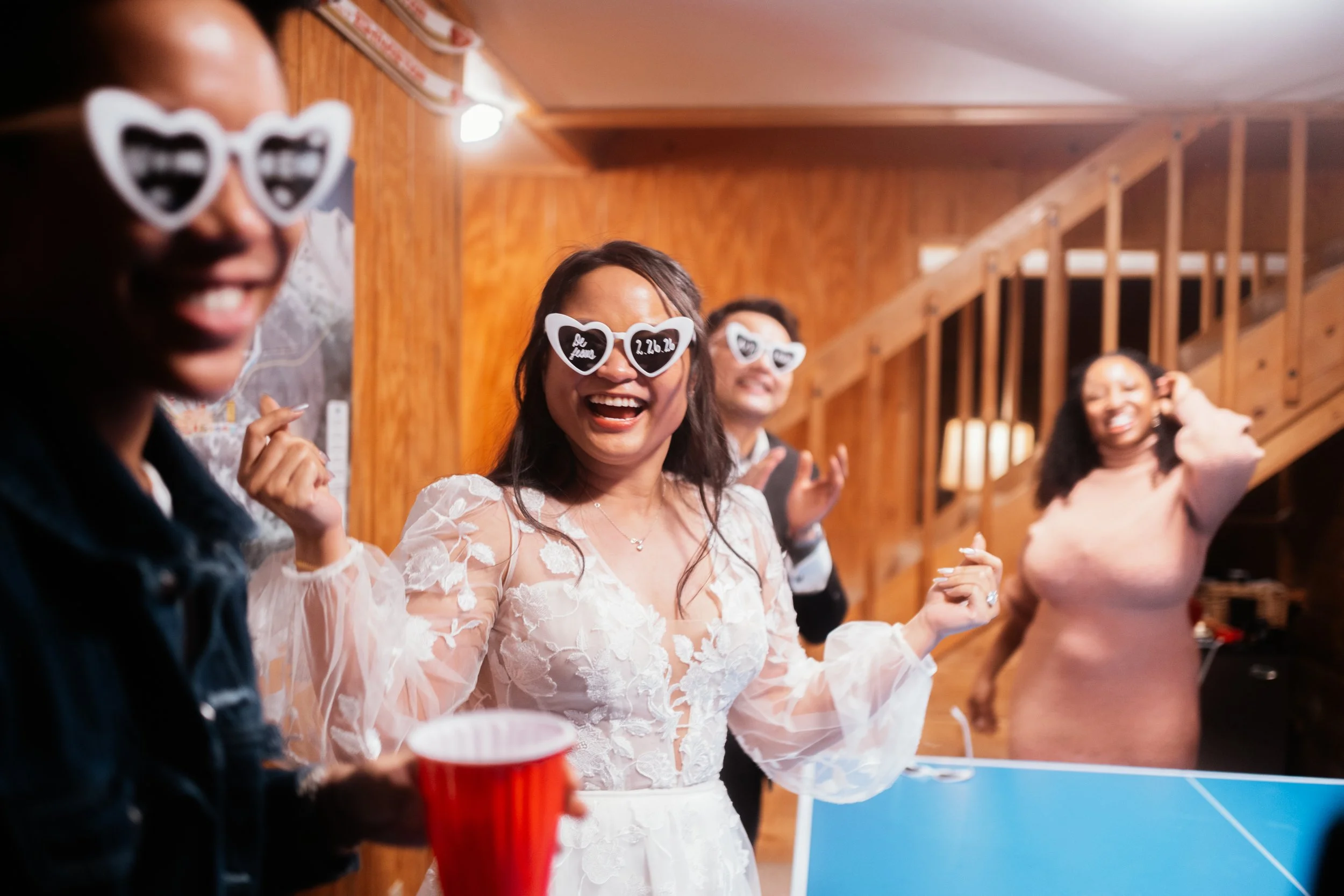 Sometimes it is loud, half-chaotic, lit by flash, full of movement and noise and people forgetting, for a moment, to curate themselves. There is something wonderfully democratic about a wedding day ending not in an immaculate tableau, but in a basement game with friends, the couple still fully inside the mess and delight of their own lives.