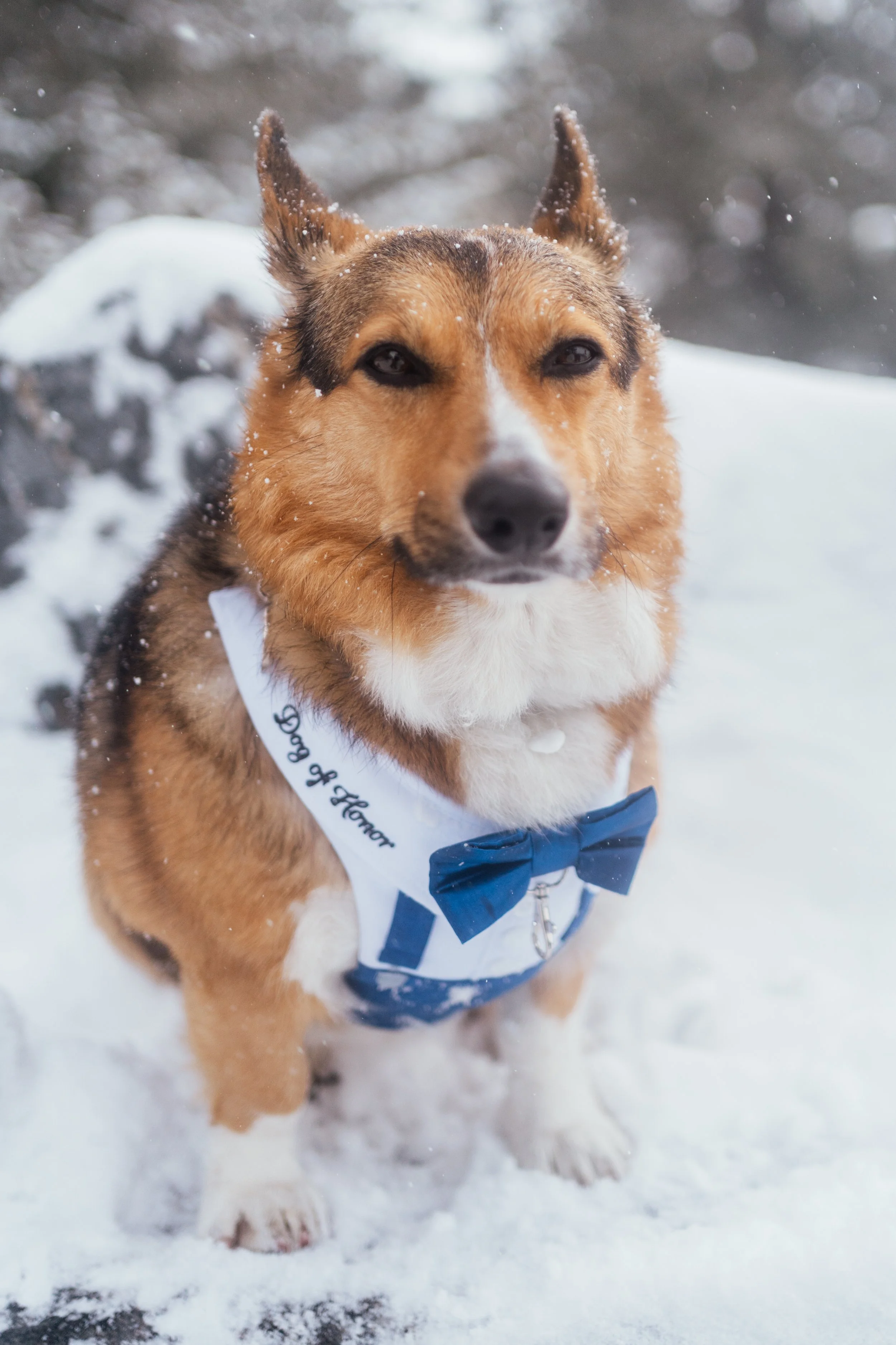 They arrived at Sapphire Point around 7:30 in the morning, within the reserved ceremony window, and used the time fully. Their dog, Bowser, was there. Their vows were gorgeous. They stood in the storm and became married in the middle of it. There is a tendency, especially online, to talk about elopements as though they are streamlined alternatives to “real” weddings, as though their intimacy somehow makes them smaller. The scale is not smaller. It is simply rearranged. Less emphasis is placed on performance and more on sensation. The experience becomes concentrated. Snow on the veil. Champagne in the cold. A dog at the ceremony. The feeling of walking around as newlyweds while weather gathers on your shoulders. Those things do not reduce the day. They thicken it.