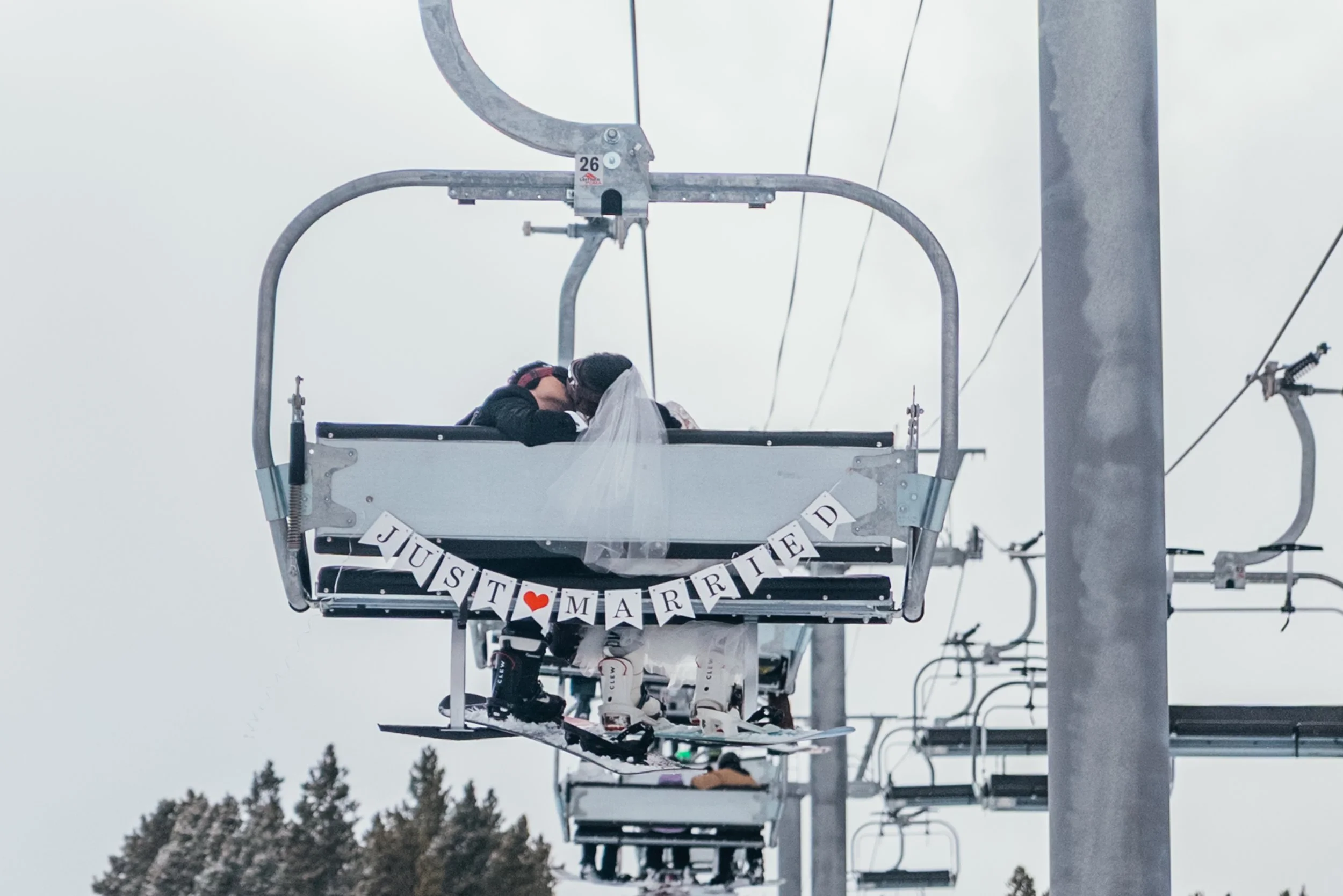 At the lift, there was a practical question that needed solving, the sort of small, oddly specific problem real wedding days are always presenting: what to do with the just married sign on the chair. They had brought little magnets and used them to secure the back, which resulted in not only a workable solution but some beautiful images too, the kind that only happen when ingenuity meets a little chaos.