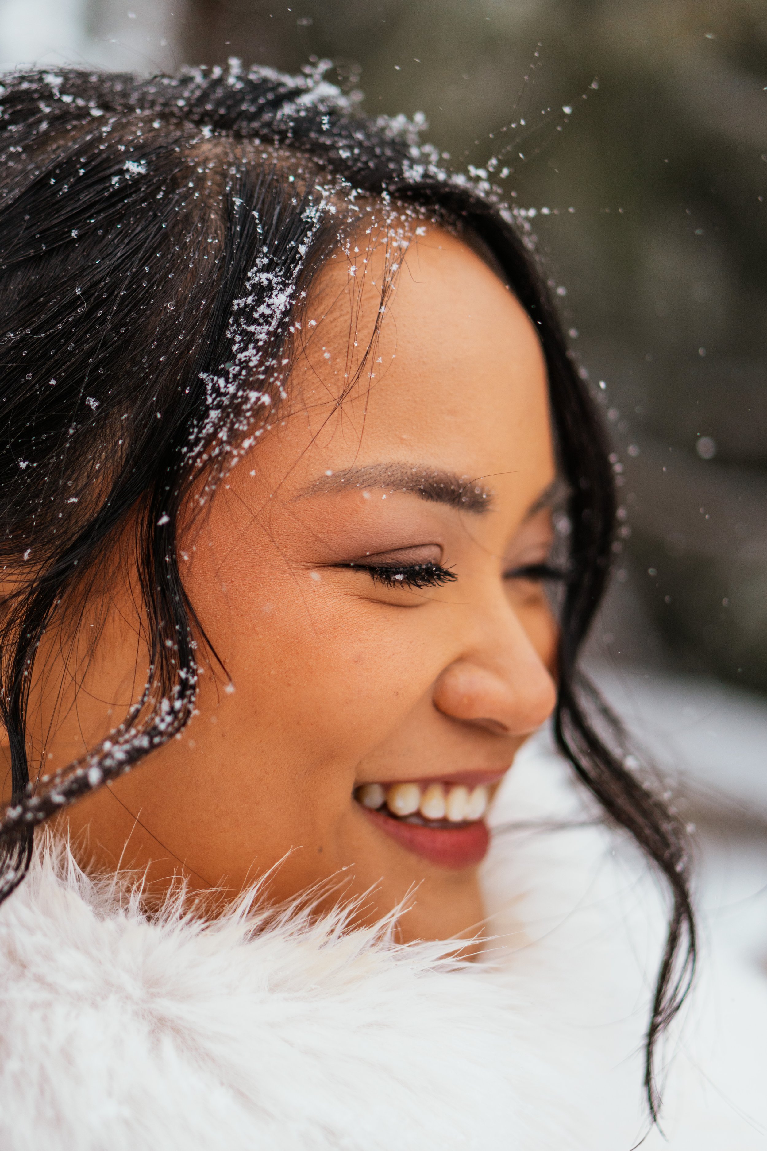 Ordinarily, the drive there delivers one of those mountain panoramas that people travel to Colorado hoping to find. On this day, the Sapphire Point view was mostly gone. Or rather, it had been replaced by something else. The snow was “dumping” in the most gorgeous way. The vista had disappeared, but the mood had arrived. That strikes me as one of the most beautiful little reversals in the whole story. Couples often imagine that scenic beauty must take one specific form. Bluebird skies. Sharp peaks. A wide clean overlook. Yet weather has its own authority. What happened here was not that the beauty failed to show up. It simply chose another costume. Snow clung to Gela’s hair, to her veil, to the fur coat she was wearing. The air itself became the atmosphere the day needed. You could not see as far, but you could feel more.