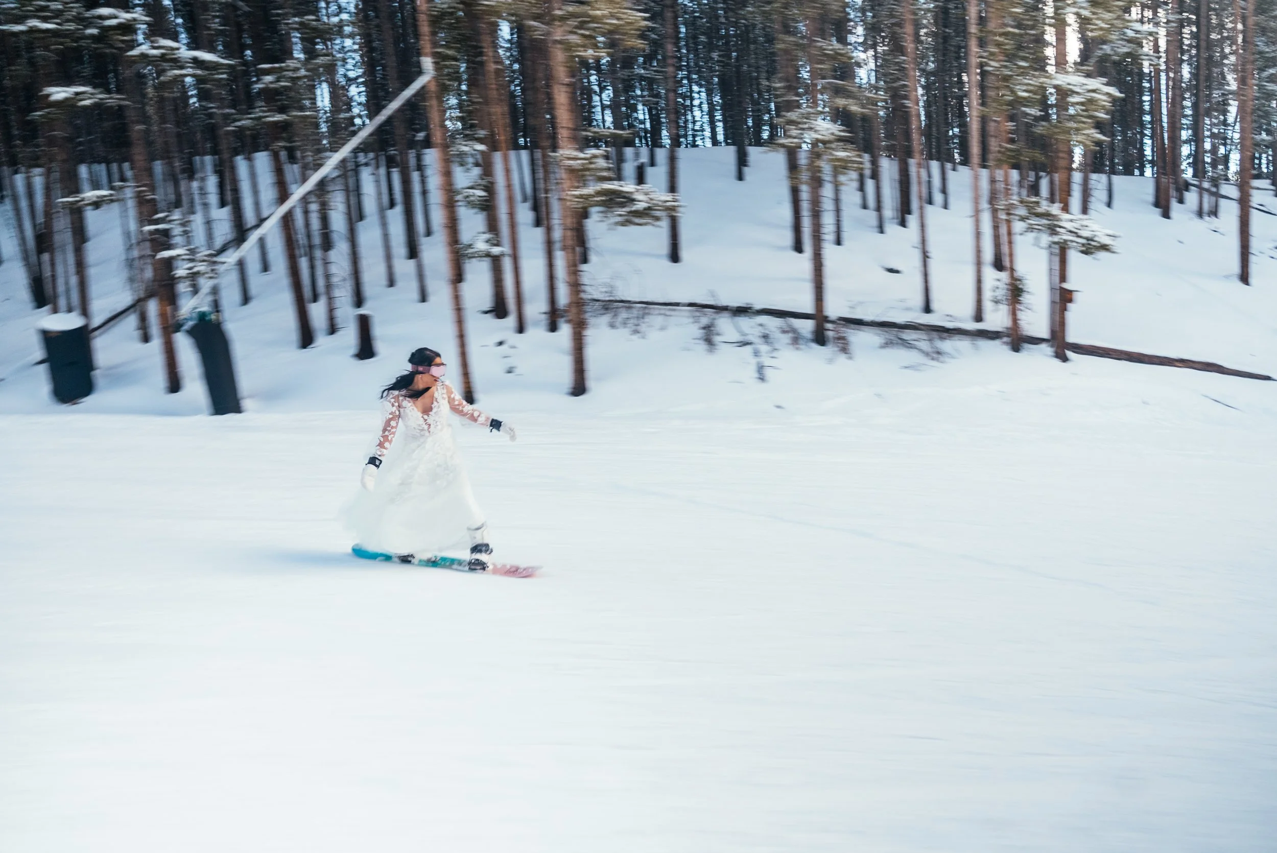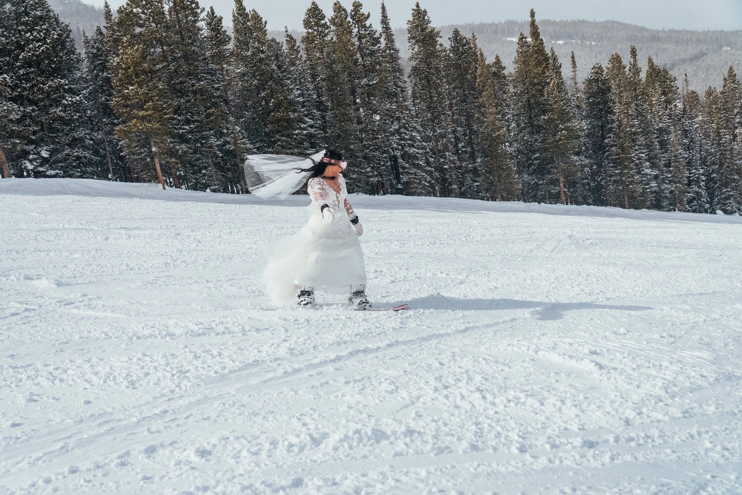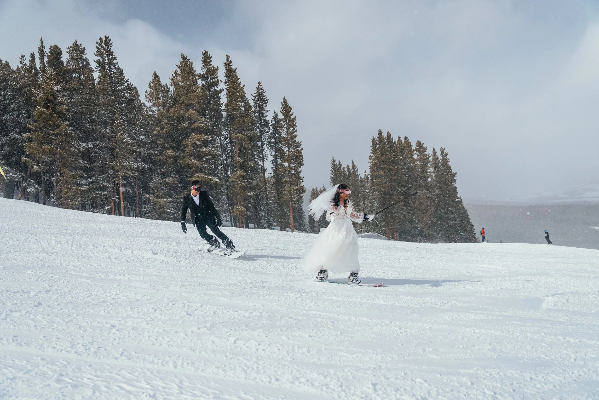 Once they reached the top, the day opened up again. Snowboarding is one of those activities that immediately changes the emotional tempo of a story. Walking through snow in wedding clothes is romantic. Riding through it is exhilarating. Suddenly the mountain was not just a backdrop or a place to take portraits. It became an instrument the day could actually play.