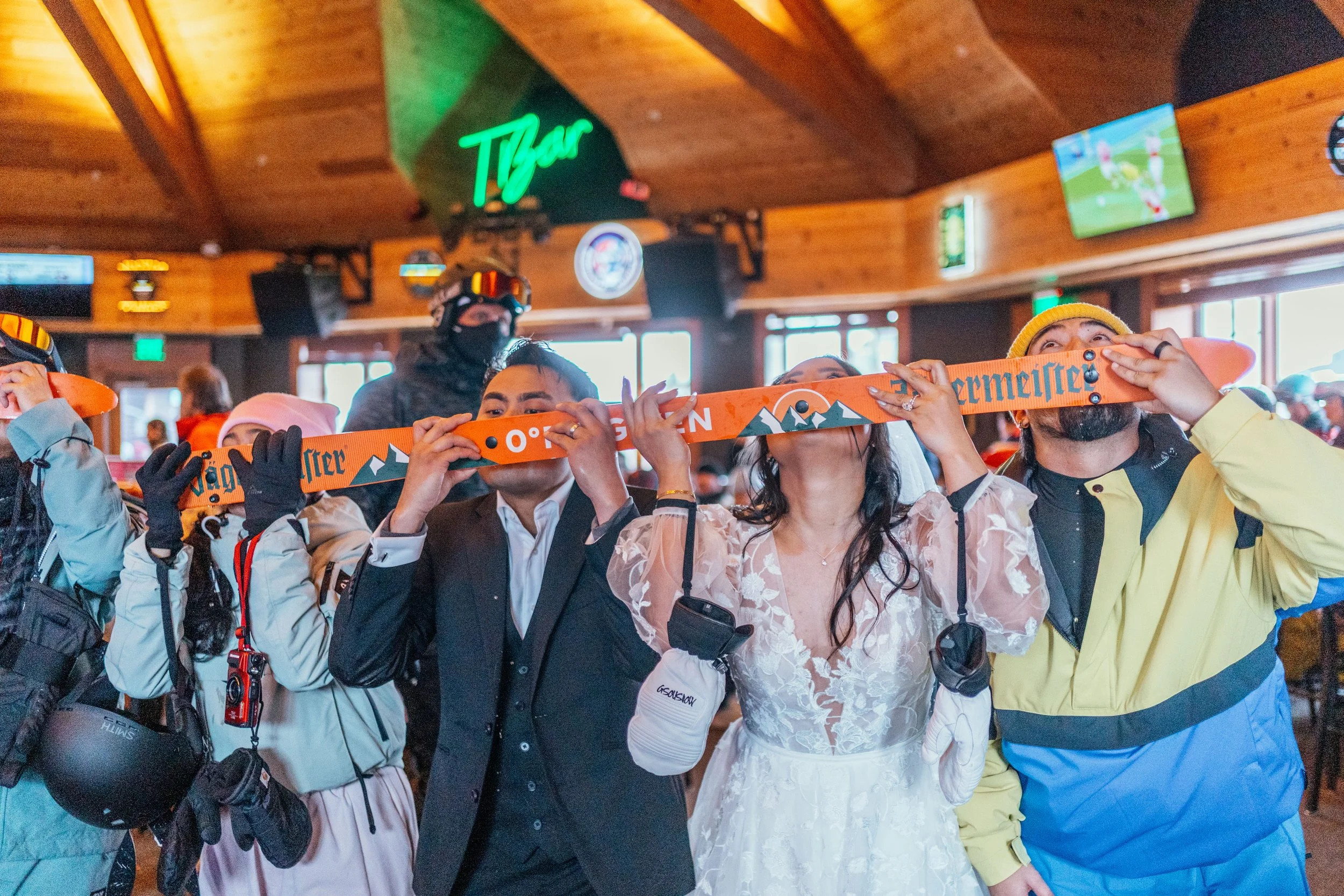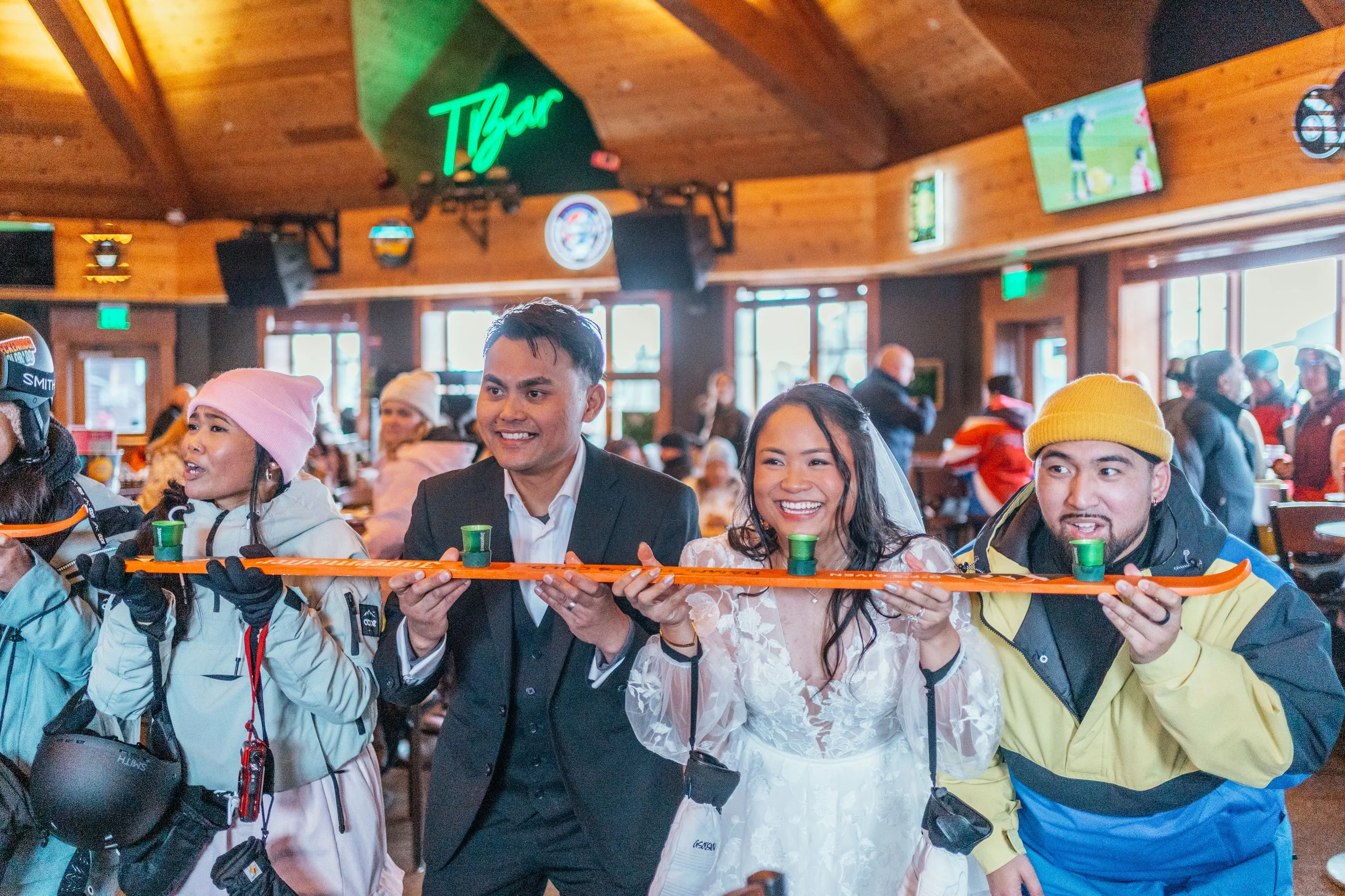 And because every good adventure contains an intermission, there was après-ski. At the base of the resort, they ducked into a bar, still wearing the evidence of the day, still unmistakably wedding-shaped, and the room, in one of those small public gestures that can feel weirdly moving, turned toward them and broke into applause. Strangers cheered. The couple laughed. The mood, already bright, somehow lifted again. There is something about a public acknowledgment like that which cuts through all the visual beauty and lands somewhere more human. Marriage, for all its private meaning, is still a social ritual. Even when the ceremony is intimate, even when the day is unconventional, there is something lovely about the world briefly noticing and responding. A bar full of people cheering for two cold, happy newlyweds in the middle of a ski day feels exactly like the sort of blessing an elopement should allow for: unscripted, communal, a little rowdy, and entirely genuine.